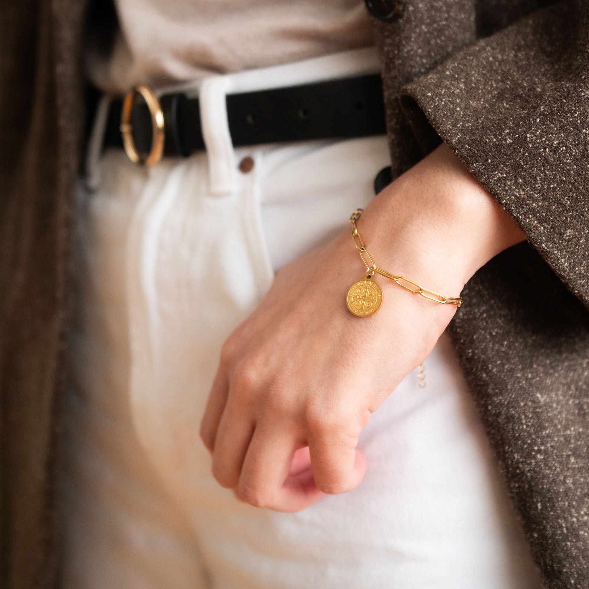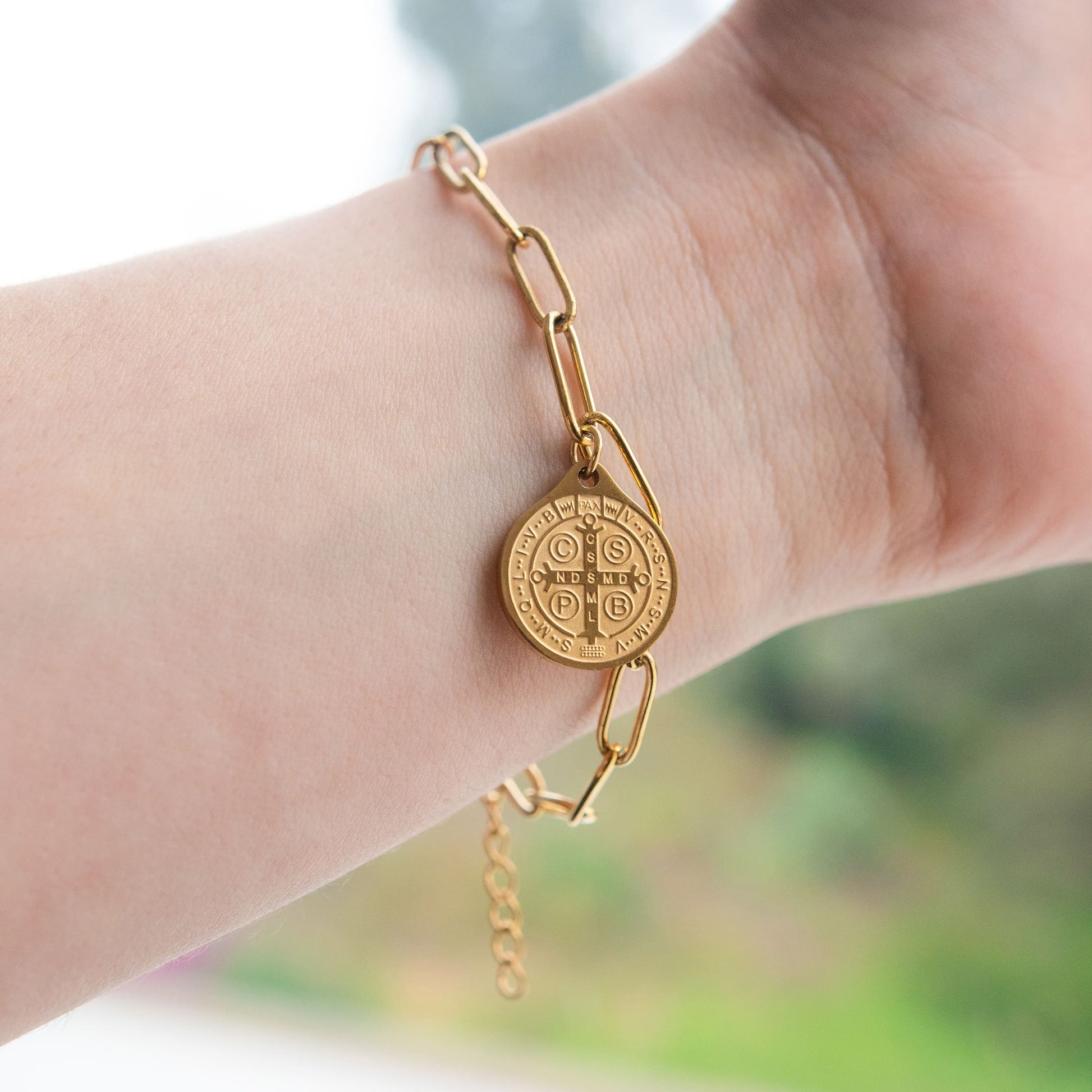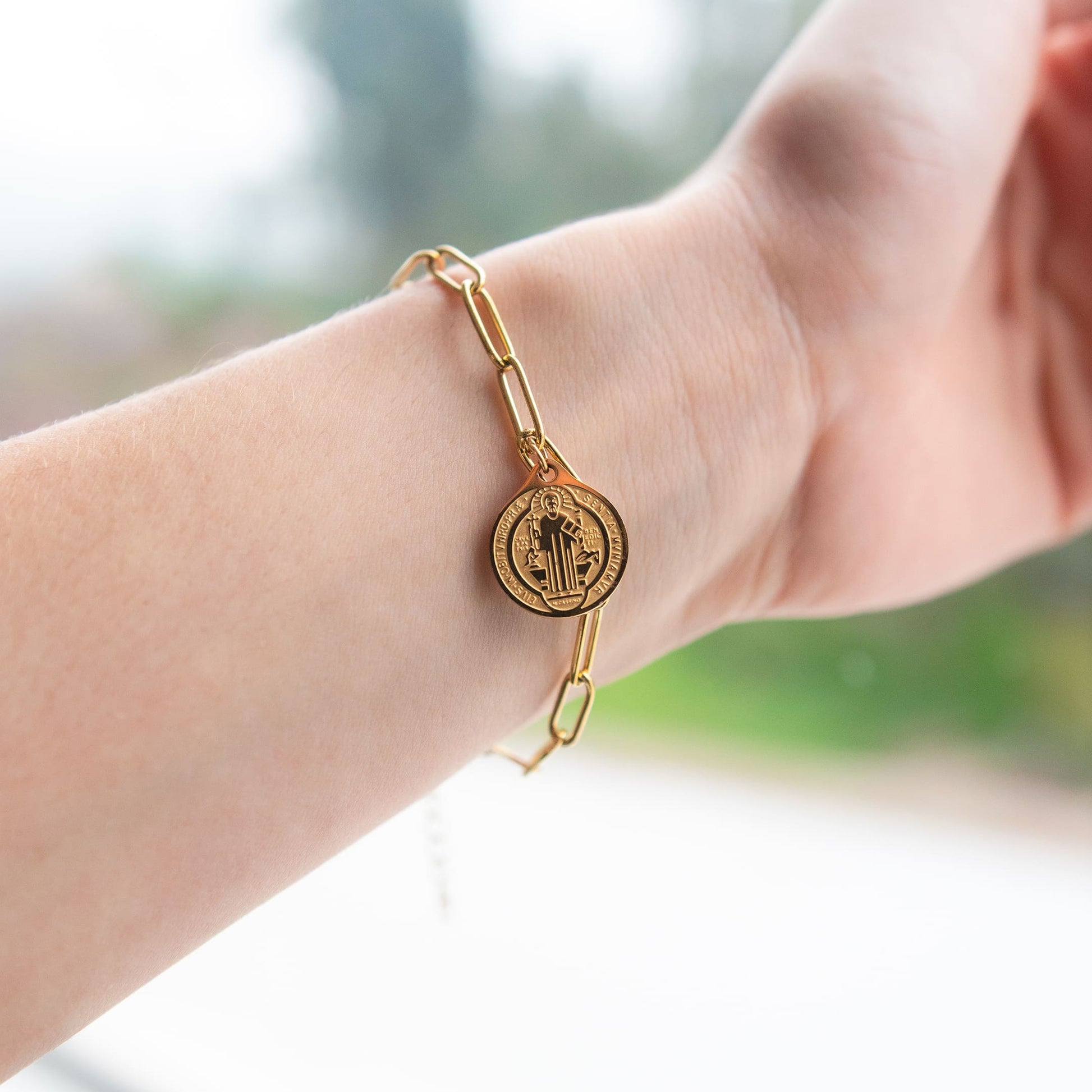 Pulsera de cadena de acero dorado con un dije de San Benito. Este diseño ajustable es un recordatorio de la protección y la guía que ofrece San Benito.