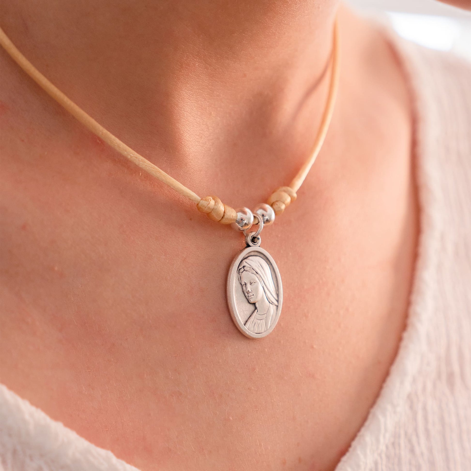 Este delicado collar captura la belleza y serenidad de la Virgen de Medjugorje, recordando su mensaje de paz.