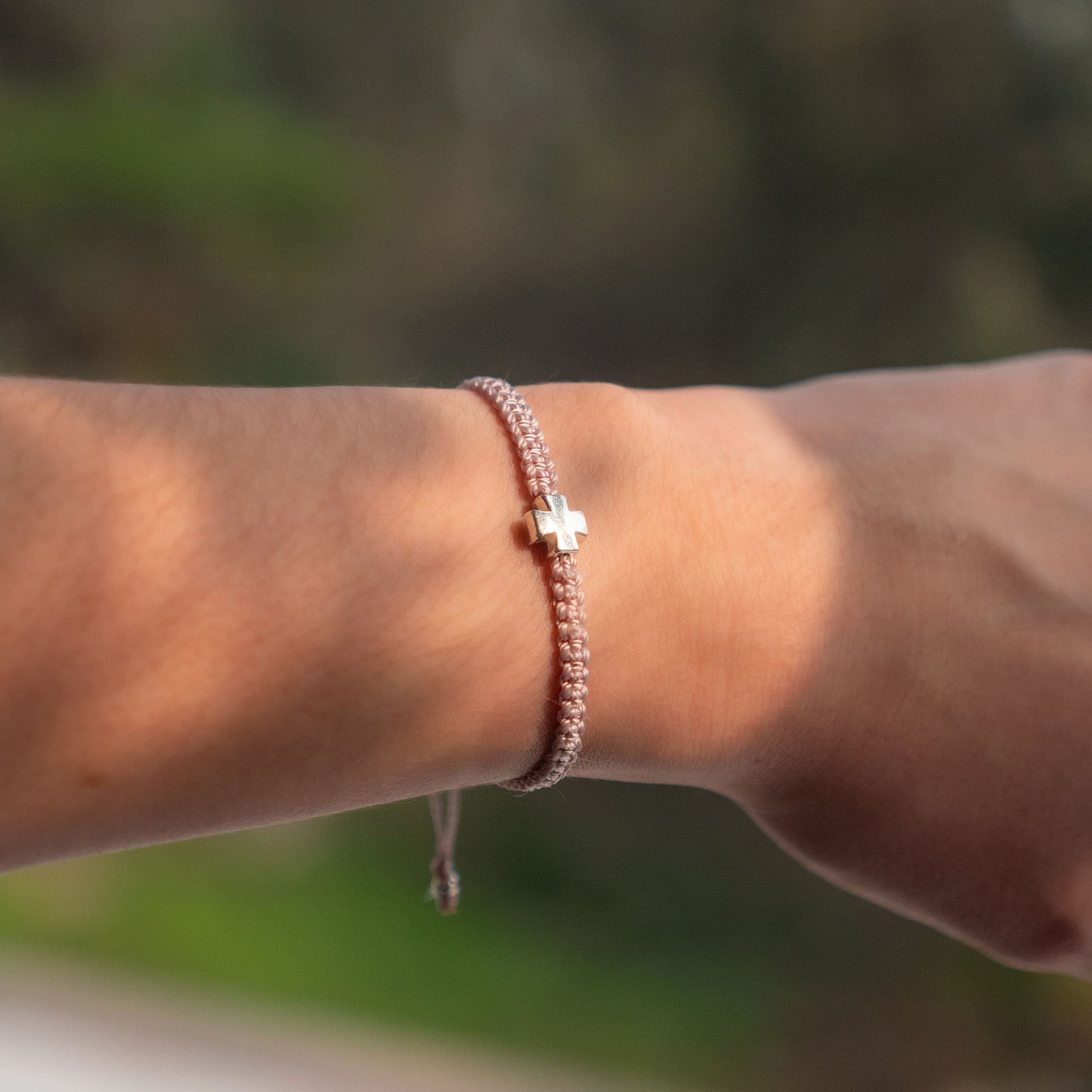 Pulsera bordada a mano, diseño inspirado en el significado de cargar la Cruz con alegría.