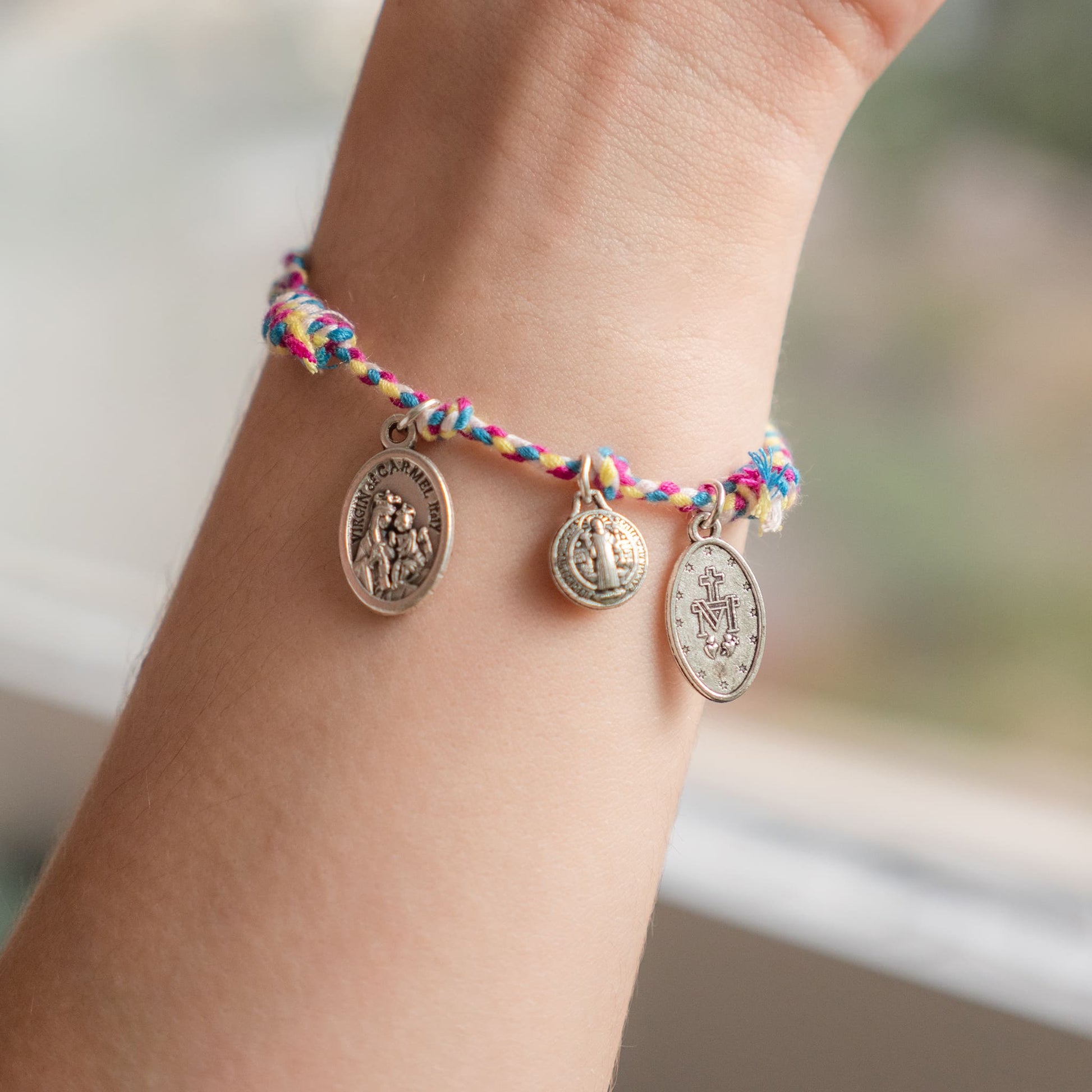 Estas medallas, importadas de Italia y hechas de plata alemana, están unidas por un hilo de algodón trenzado, ajustable para cualquier muñeca. La pulsera Tres Promesas no es solo un accesorio; es un recordatorio diario de las promesas que eliges llevar contigo, uniendo tradición y fe en un bonito diseño.